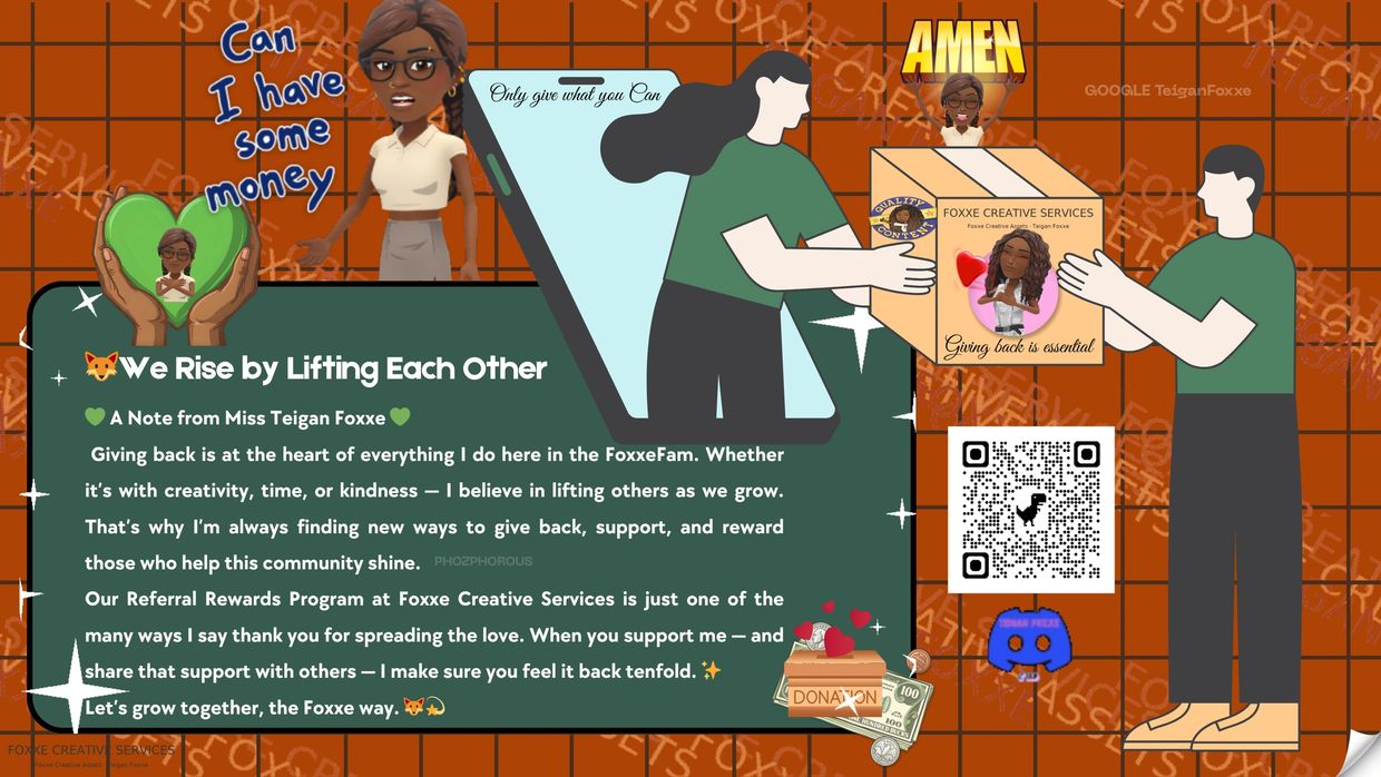 Your support through PromoFoxxe feeds right back into the FoxxeFam ecosystem — funding giveaways, loyalty rewards, and projects that help uplift everyone in the community. When you give there, you’re helping create a cycle of generosity that powers everything we do.